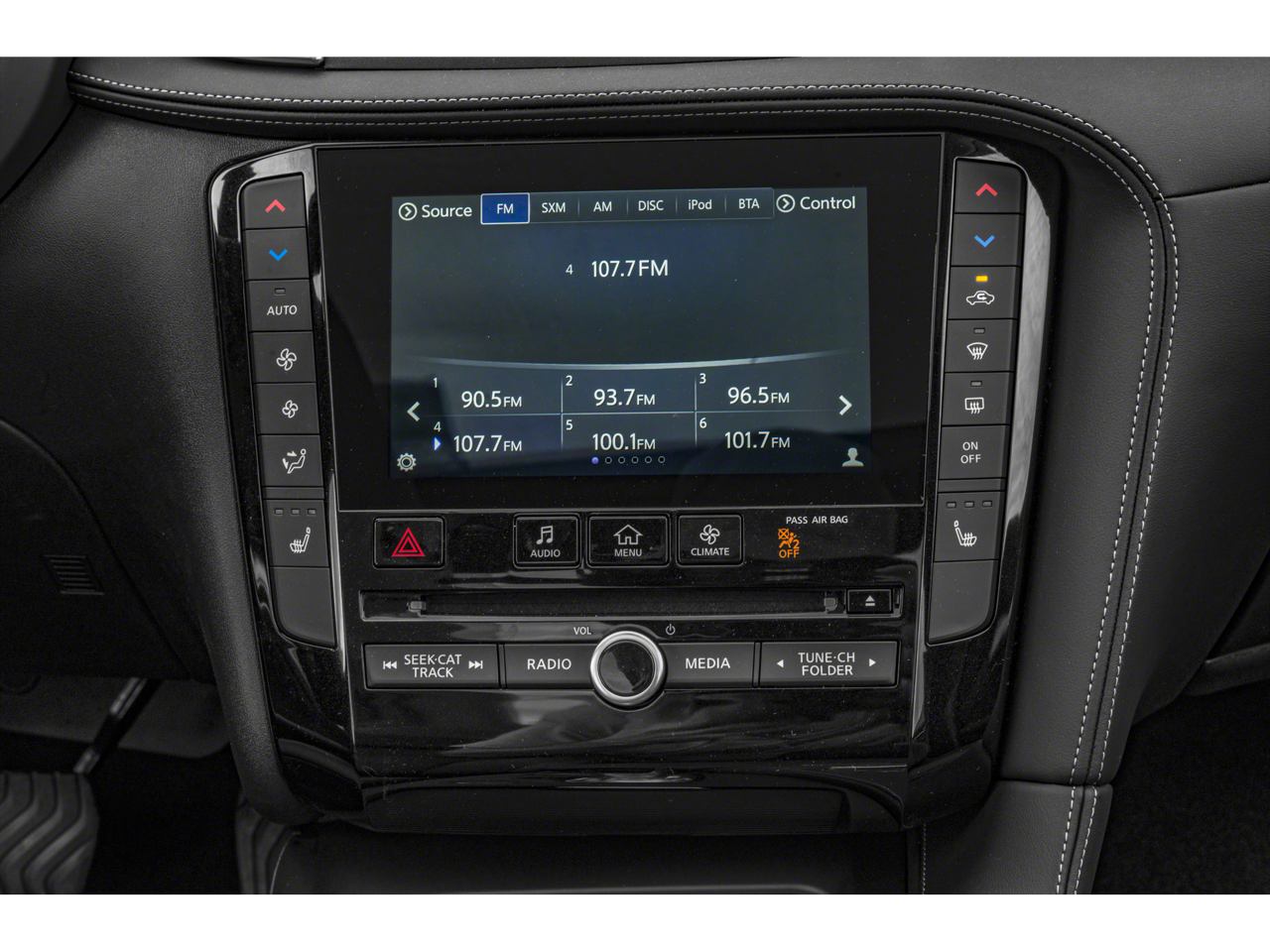 - Radio: HD Audio System -inc: INFINITI InTouch, INFINITI InTouch services, INFINITI InTouch dual display system w/upper 8" and lower 7" HD touch screens, wireless Apple CarPlay, Android Auto, SiriusXM radio w/advanced audio features and 90-day complimentary trial, INFINITI voice recognition, Siri Eyes Free, Wi-Fi hotspot and active noise cancellation