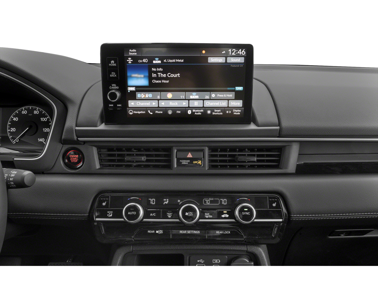 - Radio: Bose Premium Sound System -inc: 12 speakers w/subwoofer, 9" color touchscreen, Bluetooth® HandsFreeLink and streaming audio, Radio Data System (RDS), Speed-sensitive Volume Compensation (SVC), front 12-volt power outlet, wireless Apple CarPlay and Android Auto compatibility, Wi-Fi hotspot capability, Qi wireless phone charger, SMS text message function, SiriusXM (SiriusXM requires a subscription after any trial period, If you decide to continue your SiriusXM service at the end of your trial subscription, the plan you choose will automatically renew and bill at then-current rates until you call SiriusXM at 1-866-635-2349 to cancel, See our customer agreement for complete terms at www.siriusxm.com, Fees and programming subject to change, Available in the 48 contiguous United States and D.C, SiriusXM and all related marks and logos are trademarks of SiriusXM Radio Inc.), HD Radio, 2.5-amp USB type-A smartphone/audio interface port in front console, 3.0-amp USB type-C charging port in front console, Honda Satellite-Linked Navigation System w/voice recognition and Honda Real-Time Traffic (The Honda Satellite-Linked Navigation System functions in the United States (not including territories, except Puerto Rico) and Canada, Honda HD Digital Traffic service is only available in the United States, except Alaska, Please see your Honda dealer for details.), HondaLink subscription services ( complimentary trials of security for 1 year and a remote/concierge trial for 3 months, Enrollment is required to access the remote/concierge trial and to access certain features of security, At the end of each trial period, purchase of a subscription is required to continue the respective services.), multi-zone audio and CabinTalk in-car PA system