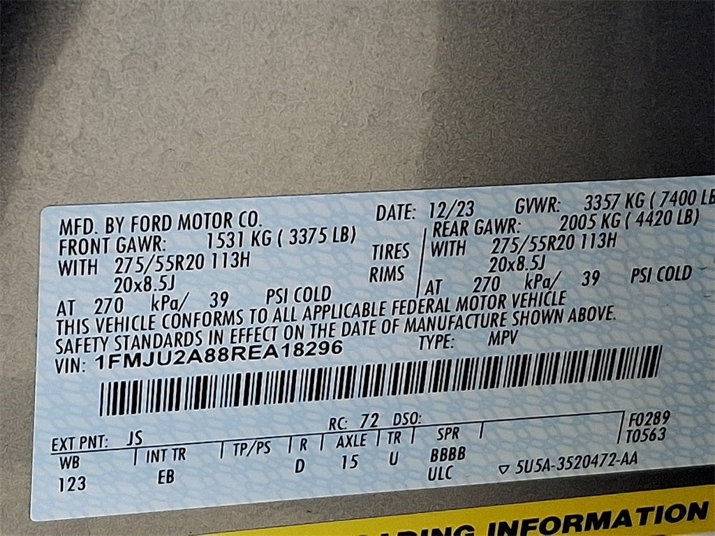 This Vehicle Includes the Following Options: Equipment Group 301A Mid Package (Panoramic Vista Roof), 4WD, 12 Speakers, 3.31 Axle Ratio, 3rd row seats: split-bench, 4-Wheel Disc Brakes, ABS brakes, Adjustable pedals, Air Conditioning, Alloy wheels, AM/FM radio: SiriusXM with 360L, Auto High-beam Headlights, Auto-dimming door mirrors, Auto-dimming Rear-View mirror, Automatic temperature control, Brake assist, Bumpers: body-color, Compass, Delay-off headlights, Driver door bin, Driver vanity mirror, Dual front impact airbags, Dual front side impact airbags, Electronic Stability Control, Emergency communication system: SYNC 4 911 Assist, Exterior Parking Camera Rear, Four wheel independent suspension, Front anti-roll bar, Front Bucket Seats, Front Center Armrest, Front dual zone A/C, Front fog lights, Front License Plate Bracket, Front reading lights, Fully automatic headlights, Garage door transmitter, Heated & Ventilated Leather Front Captain's Chairs, Heated door mirrors, Heated front seats, Heated rear seats, Heated steering wheel, Illuminated entry, Leather steering wheel, Low tire pressure warning, Memory seat, Navigation system: Connected Navigation, Occupant sensing airbag, Outside temperature display, Overhead airbag, Overhead console, Panic alarm, Passenger door bin, Passenger vanity mirror, Pedal memory, Power door mirrors, Power driver seat, Power Liftgate, Power moonroof, Power passenger seat, Power steering, Power windows, Radio data system, Radio: B&O Sound System by Bang & Olufsen, Rain sensing wipers, Rear air conditioning, Rear anti-roll bar, Rear reading lights, Rear window defroster, Rear window wiper, Reclining 3rd row seat, Remote keyless entry, Security system, SiriusXM w/360L, Speed control, Speed-sensing steering, Speed-Sensitive Wipers, Split folding rear seat, Spoiler, Steering wheel memory, Stee