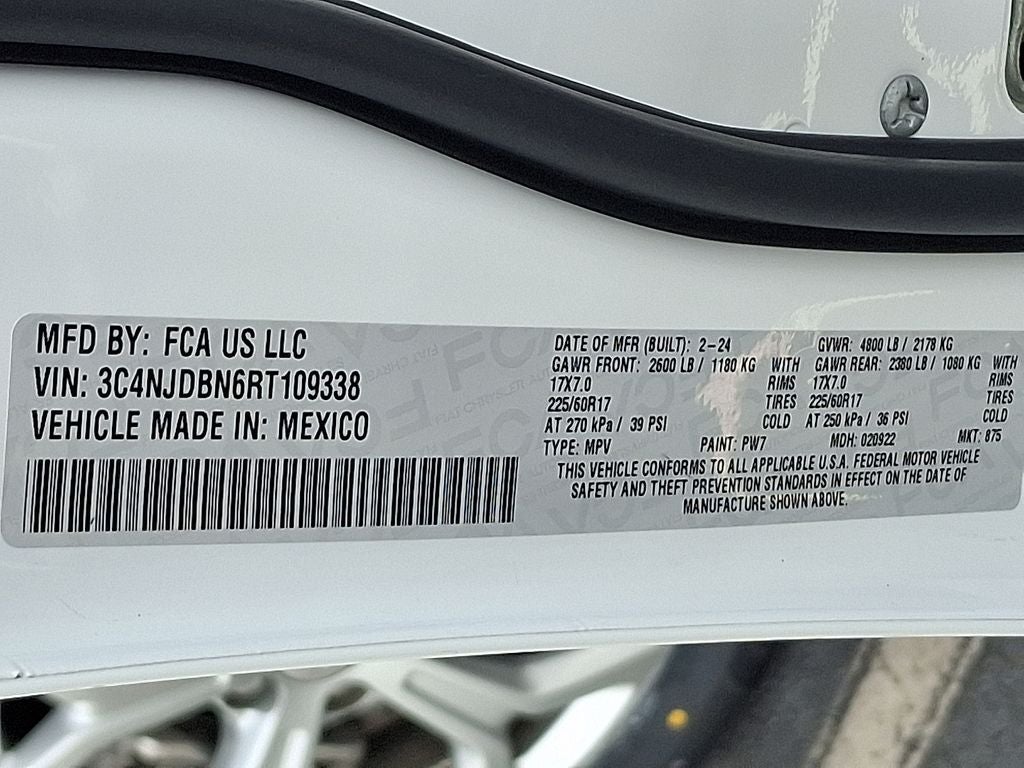 THIS VEHICLE INCLUDES THE FOLLOWING FEATURES AND OPTIONS: Quick Order Package 29J Latitude, 4WD, 17 x 7 Aluminum Wheels, 3.73 Final Drive Ratio, 4-Wheel Disc Brakes, 6 Speakers, ABS brakes, Air Conditioning, Alloy wheels, AM/FM radio: SiriusXM, Auto High-beam Headlights, Brake assist, Bumpers: body-color, Compass, Delay-off headlights, Driver door bin, Driver vanity mirror, Dual front impact airbags, Dual front side impact airbags, Electronic Stability Control, Emergency communication system: Jeep Connect, Four wheel independent suspension, Front anti-roll bar, Front Bucket Seats, Front Center Armrest w/Storage, Front fog lights, Front License Plate Bracket, Front reading lights, Fully automatic headlights, Heated door mirrors, Illuminated entry, Knee airbag, Leather Shift Knob, Leather steering wheel, Low tire pressure warning, Occupant sensing airbag, Outside temperature display, Overhead airbag, Overhead console, Panic alarm, ParkView Rear Back-Up Camera, Passenger door bin, Passenger vanity mirror, Power door mirrors, Power steering, Power windows, Premium Cloth/Vinyl Bucket Seats, Radio: Uconnect 5 w/10.1 Display, Rear anti-roll bar, Rear seat center armrest, Rear window defroster, Rear window wiper, Remote keyless entry, Security system, Speed control, Split folding rear seat, Spoiler, Steering wheel mounted audio controls, Tachometer, Telescoping steering wheel, Tilt steering wheel, Traction control, Trip computer, and Variably intermittent wipers. 24/32 City/Highway MPG